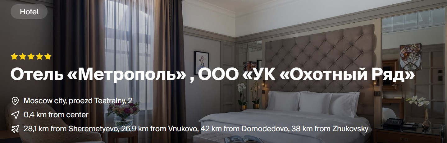 Metropol Hotel คือโรงแรมหรูระดับ 5 ดาวที่มีชื่อเสียงโด่งดัง ด้วยสถาปัตยกรรมอันเป็นเอกลักษณ์และคุณค่าทางประวัติศาสตร์ โรงแรมตั้งอยู่ในย่านศูนย์กลางประวัติศาสตร์ของกรุงมอสโก ใช้เวลาเดินเพียงประมาณ 3 นาที ก็ถึง จัตุรัสแดง พระราชวังเครมลิน และห้าง GUM รายล้อมด้วยอนุสาวรีย์ทางสถาปัตยกรรม แหล่งท่องเที่ยวทางประวัติศาสตร์ และสถานที่ทางวัฒนธรรมมากมาย ซึ่งร่วมกันสร้างบรรยากาศที่สง่างาม ขรึมขลัง และทรงคุณค่าให้กับพื้นที่แห่งนี้